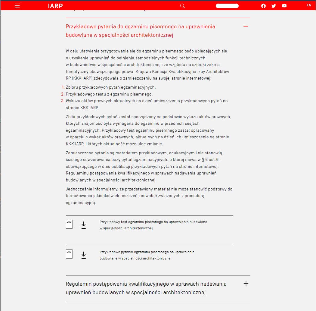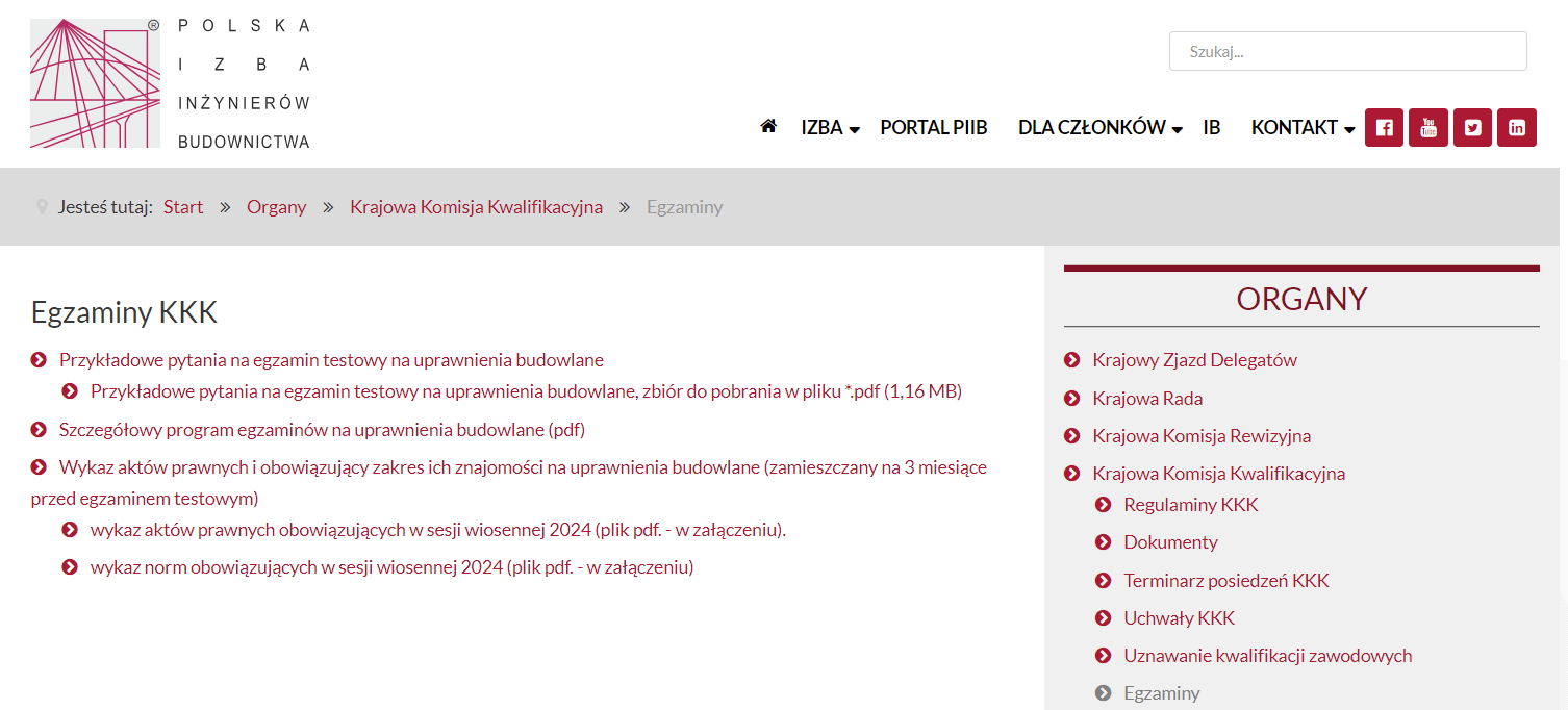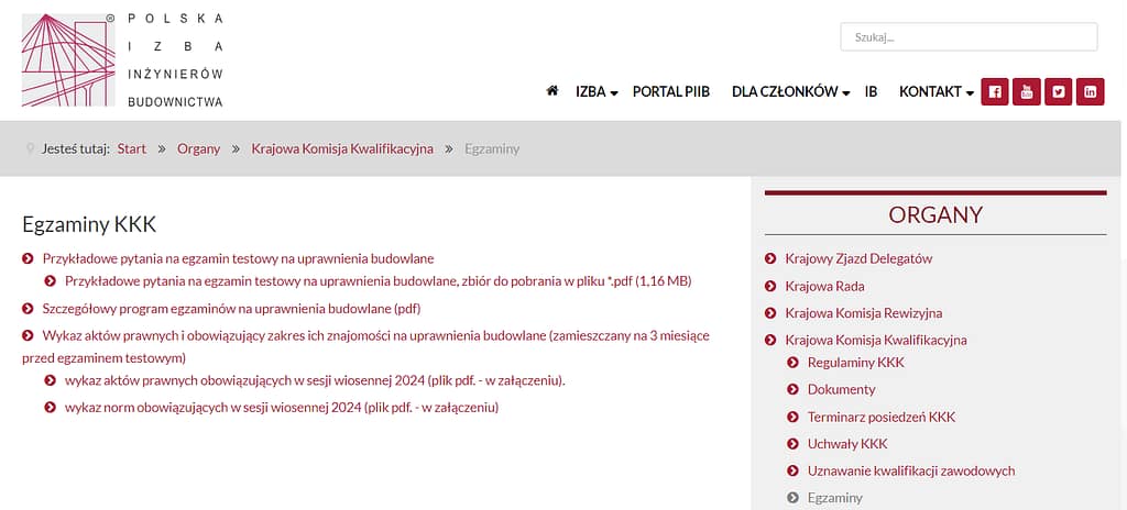 Tak samo samorząd zawodowy POLSKA IZBA INŻYNIERÓW BUDOWNICTWA od dawna (np. od 2011 roku), publikuje przykładowe pytania na egzaminy testowe, szczegółowy program egzaminów wykaz aktów prawnych obowiązujących np. w sesji 2024 r. jak widać poniżej.