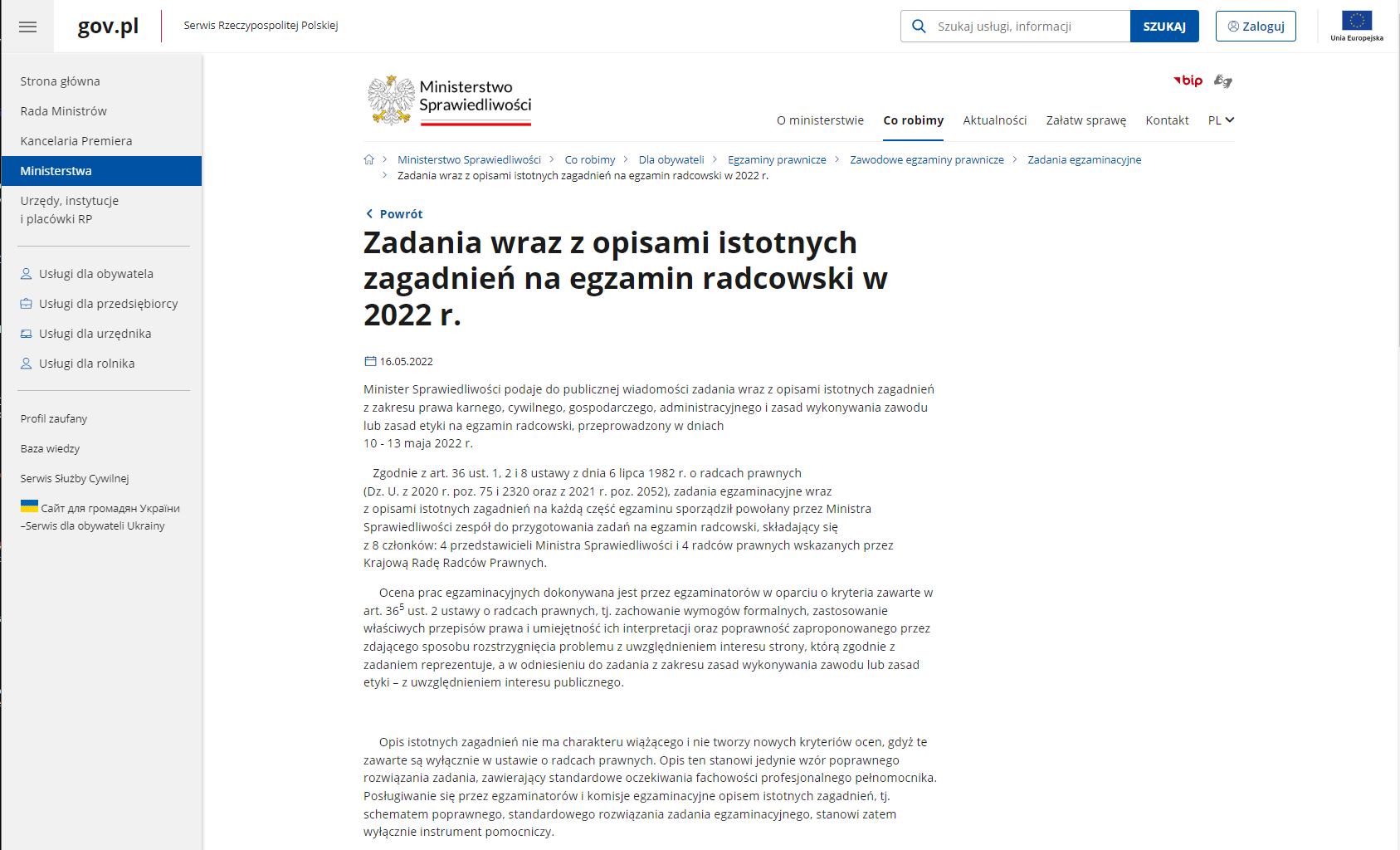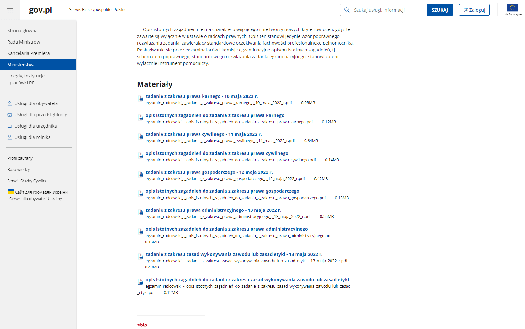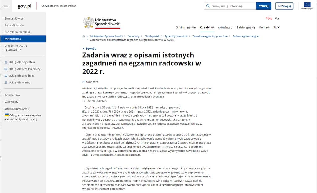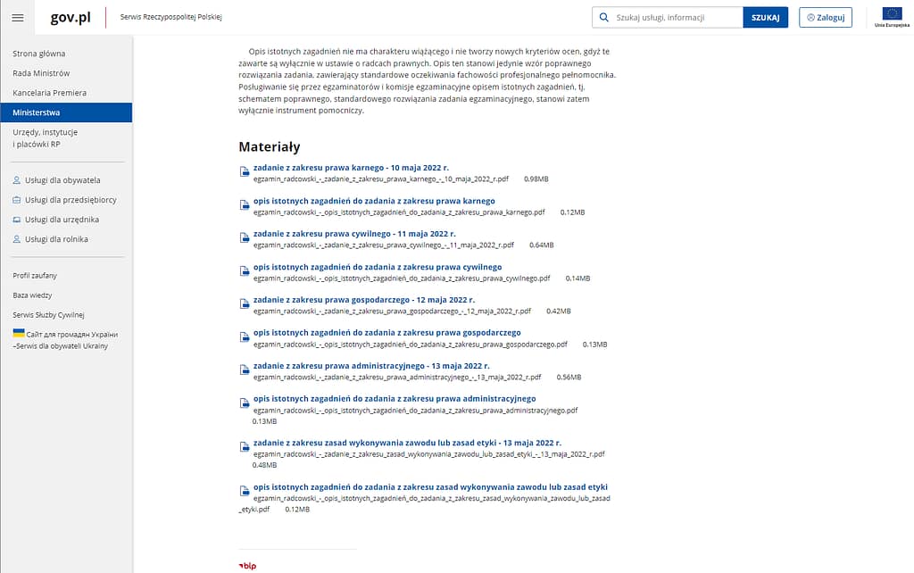 Na stronie ministerstwa są publikowane nie tyle pytania co zadania z poszczególnych zakresów prawa karnego, cywilnego, gospodarczego i administracyjnego.