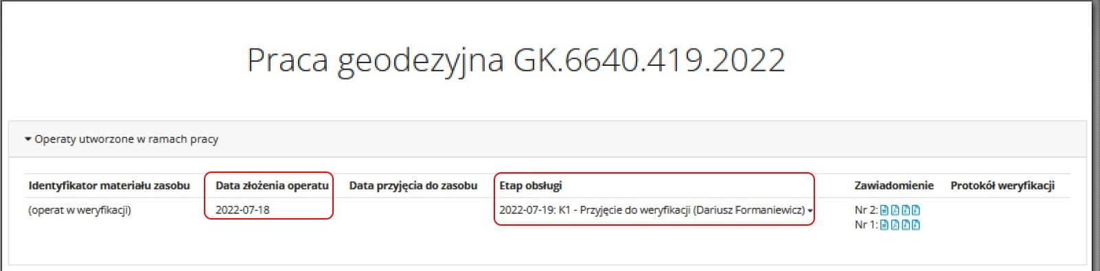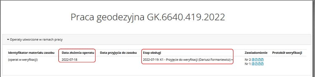 W tym samym dniu, otrzymania protokołu weryfikacyjnego, przedstawiciel Firmy GEODEZY ZACHARCZUK, t.j. 18 lipca poprawił usterkę dotyczącą nazwiska i powtórnie przesłał zawiadomienie o zakończeniu prac załączając poprawiony operat. Na uwagę zasługuje fakt, że kierownik prac w imieniu firmy nie zgodził się z nieprawidłowością „Brak numerów KW” i złożył równocześnie z zawiadomieniem pismo o którym mowa w art. 12b ust. 7 prawa geodezyjnego.