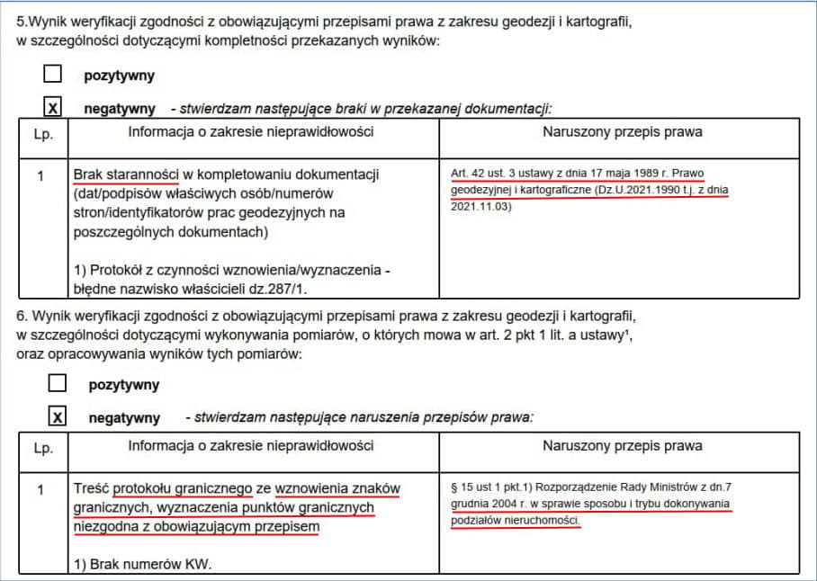 Po upływie 3 dni t.j. 18 lipca firma GEODEZY ZACHARCZUK otrzymała negatywny protokół weryfikacji w którym zamieszczono dwie nieprawidłowości jedna to z dziedziny estetyki „brak staranności” a druga to z dziedziny „pomieszane z poplątanym”, bo obowiązek zamieszczania numerów KW w protokole wznowienia/wyznaczenia… w trybie art. 39 prawa geodezyjnego uzasadnia się przepisem wykonawczym do UOGN ws. sposobu i trybu dokonywania podziałów!?