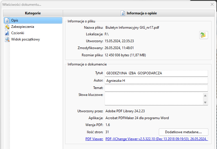 Geodezyjna Izba Gospodarcza w Biuletynie GIG nr 17 opublikowała dokument, który został utworzony 15 maja br. o godz. 22:35:23 a ostatecznie zmodyfikowany 26 maja br. o godz. 11:48:01