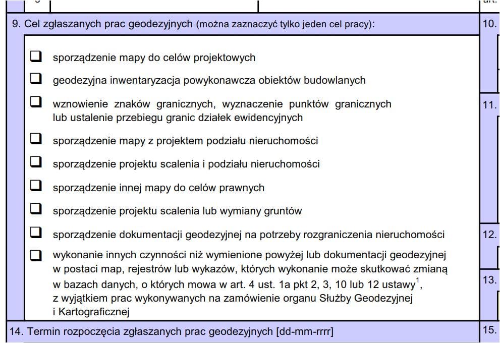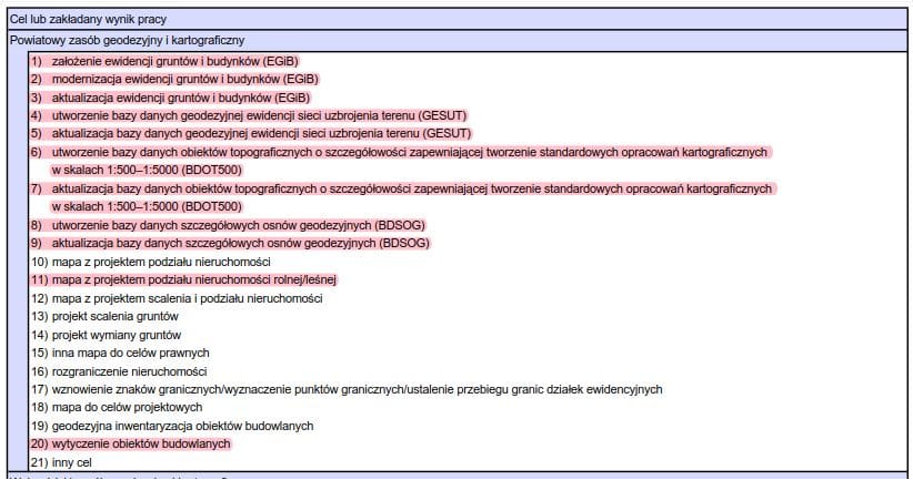 Cele, które pozostawiono w zgłoszeniach prac w wielu przypadkach doczekały się zmian uściślających jak np. stare „16) rozgraniczenie nieruchomości” zastąpiono „8) sporządzenie dokumentacji geodezyjnej na potrzeby rozgraniczenia nieruchomości„. W związku z tym będziemy musieli sobie przyswoić nowy katalog celów: