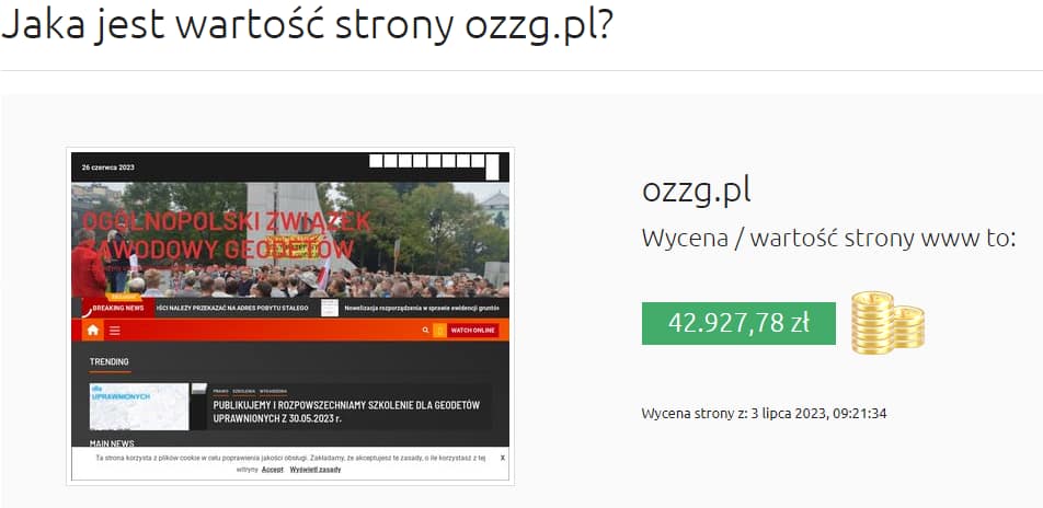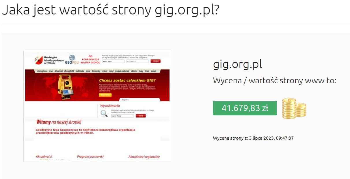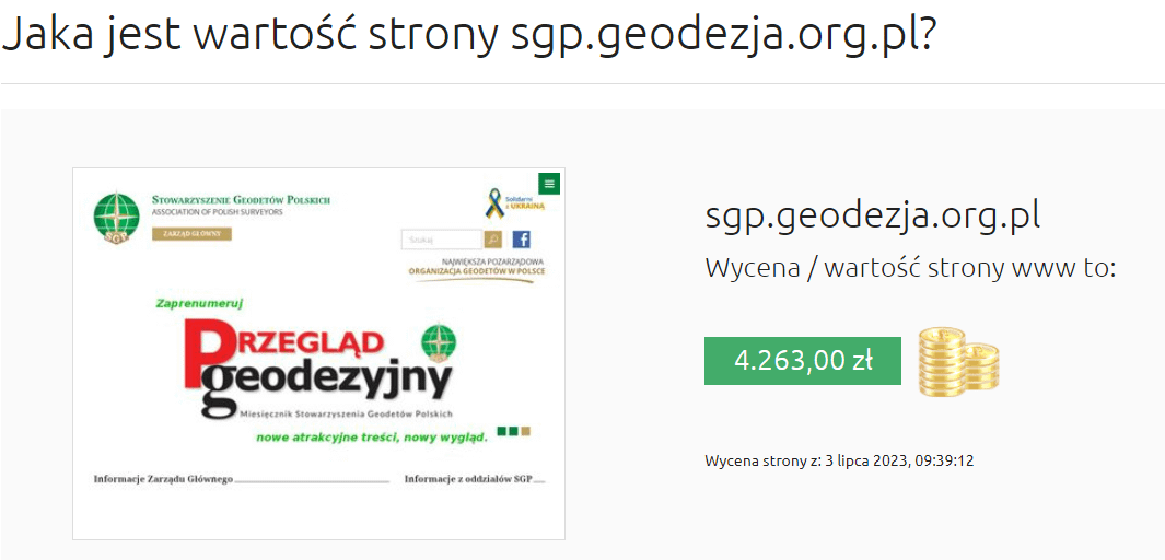 Cena podobna do naszej, choć minimalnie mniejsza. To pora teraz sprawdzić jak zostanie wyceniona strona „100letniej” organizacji geodezyjnej, której honorowym członkiem był sam BOLESŁAW BIERUT: