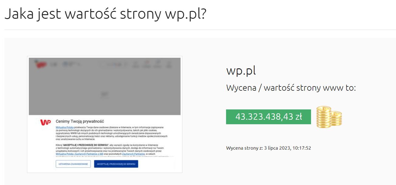 No nie do wiary! Tak słaby wynik bo prawie 10 krotnie gorszy od GIG i OZZG to jakieś nieporozumienie… Dlatego sprawdźmy jak np. zostanie wyceniona strona tuza internetowego, jakim jest np. wp.pl: