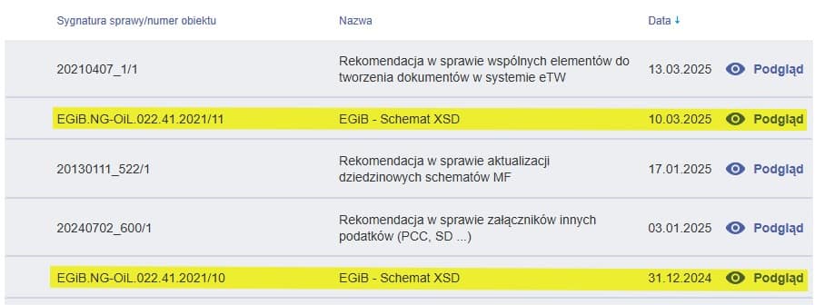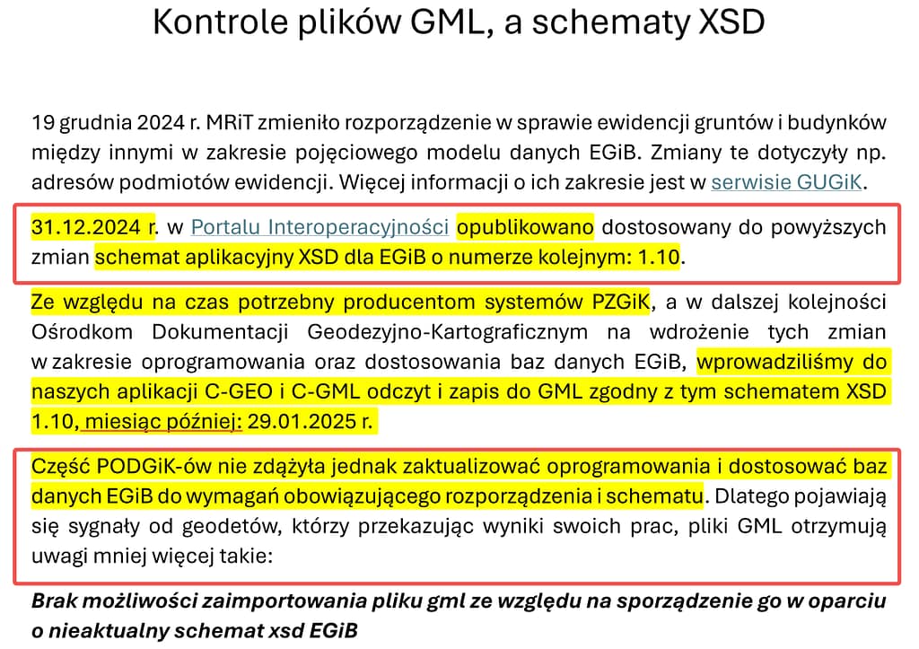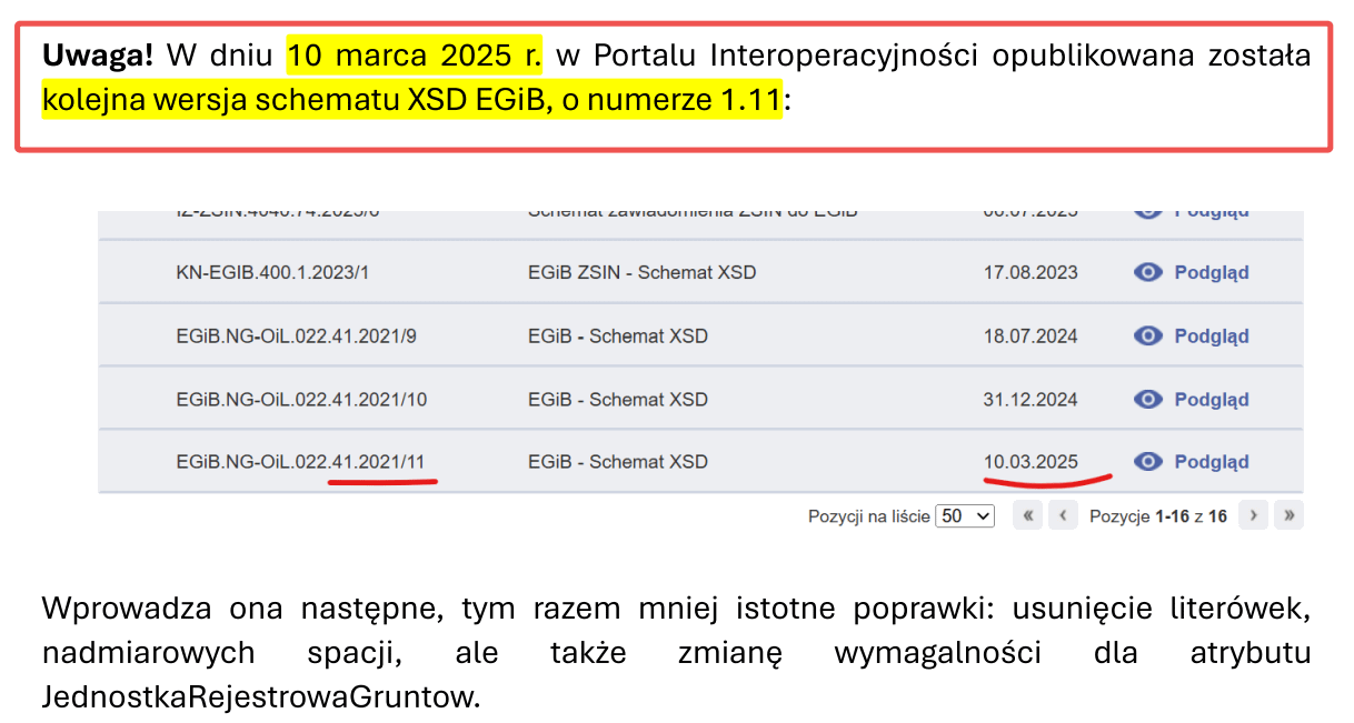 Poniższy komunikat o opublikowaniu zmian schematu aplikacyjnego XSD dla EGiB z daty 31.12.2024 r. już został zastąpiony nowym, data publikacji j.w. tzn. 10.03.2025 r.