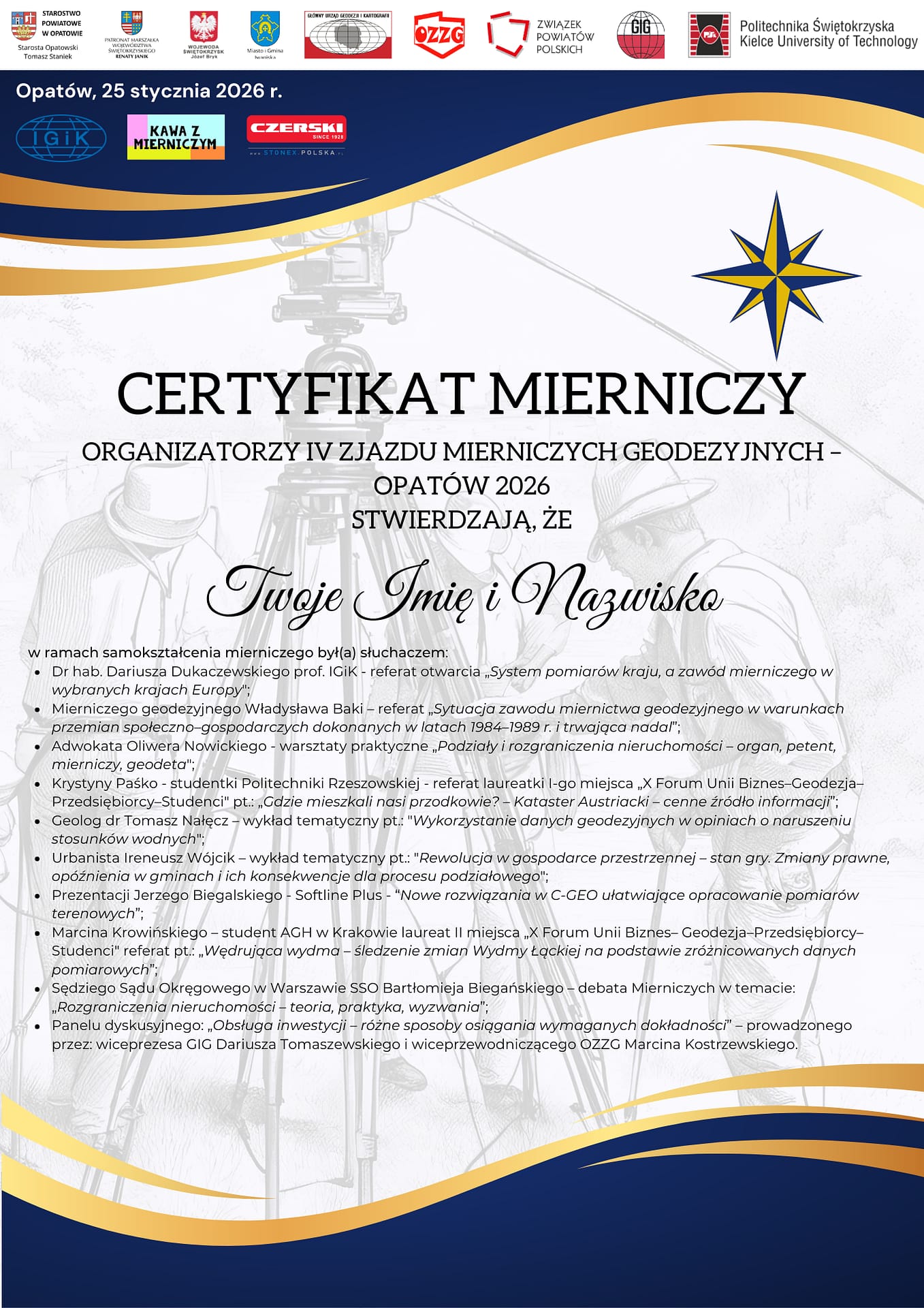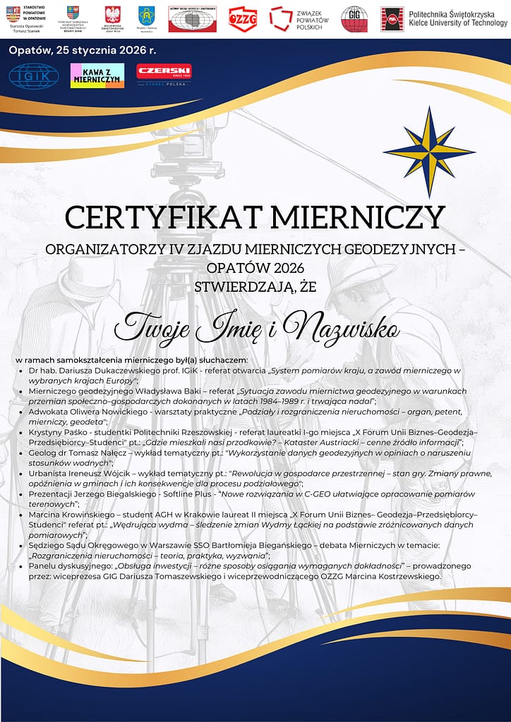 To już oficjalne! IV Zjazd Mierniczych Geodezyjnych – Opatów 2026 zyskał rangę wydarzenia priorytetowego dla polskiej geodezji. Z dumą prezentujemy listę autorytetów i mediów, które objęły nasze spotkanie Patronatem i Wsparciem: